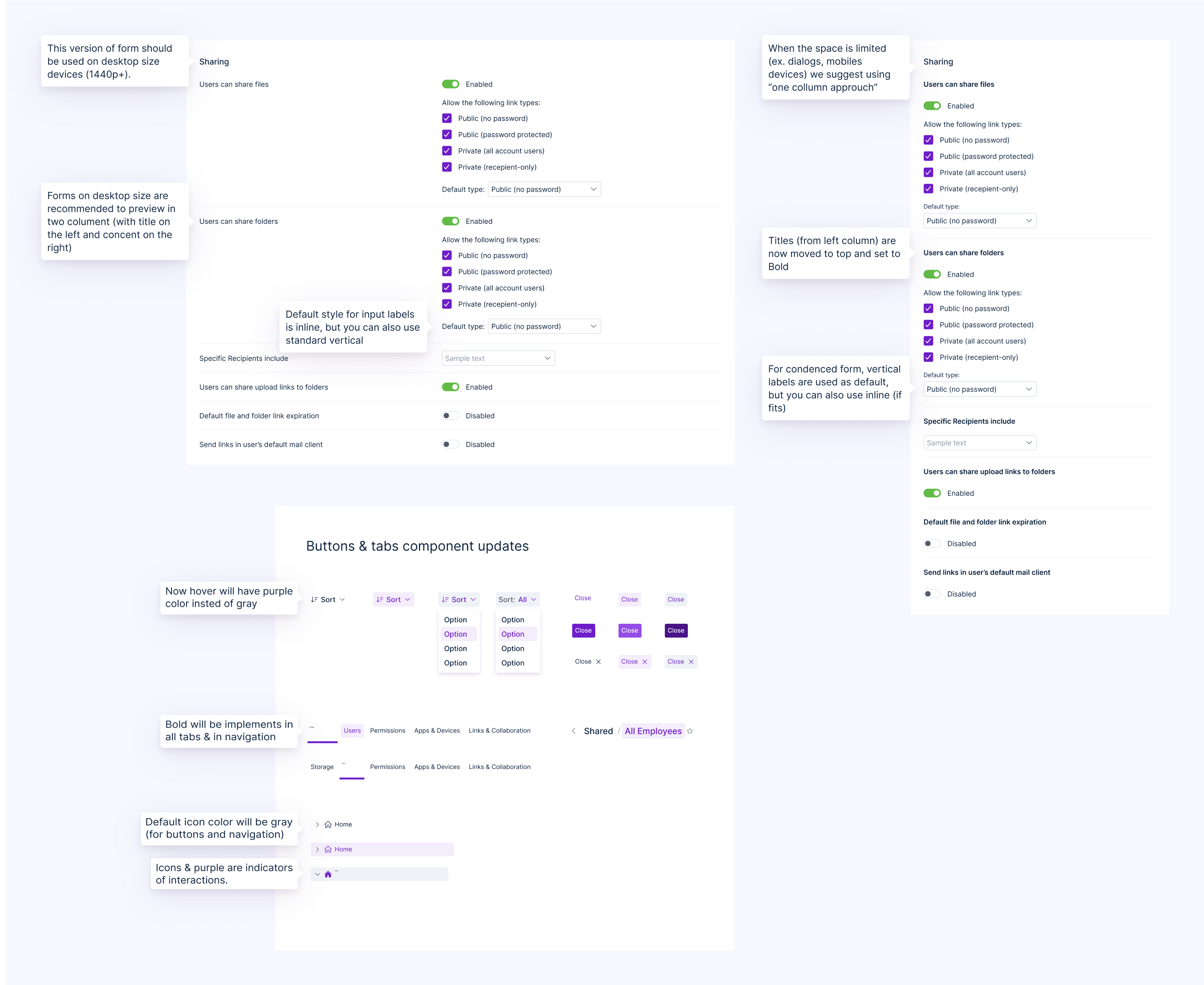 Because of Egnyte’s strict security protocols, we were unable to conduct open beta releases or broader user testing outside the organization. This meant many design decisions had to be validated internally and iterated with limited external feedback. To support alignment and adoption across teams, we shared the design system documentation company-wide. This helped standardize implementation across different departments and created a reference point for consistent usage, even in the absence of traditional testing cycles.