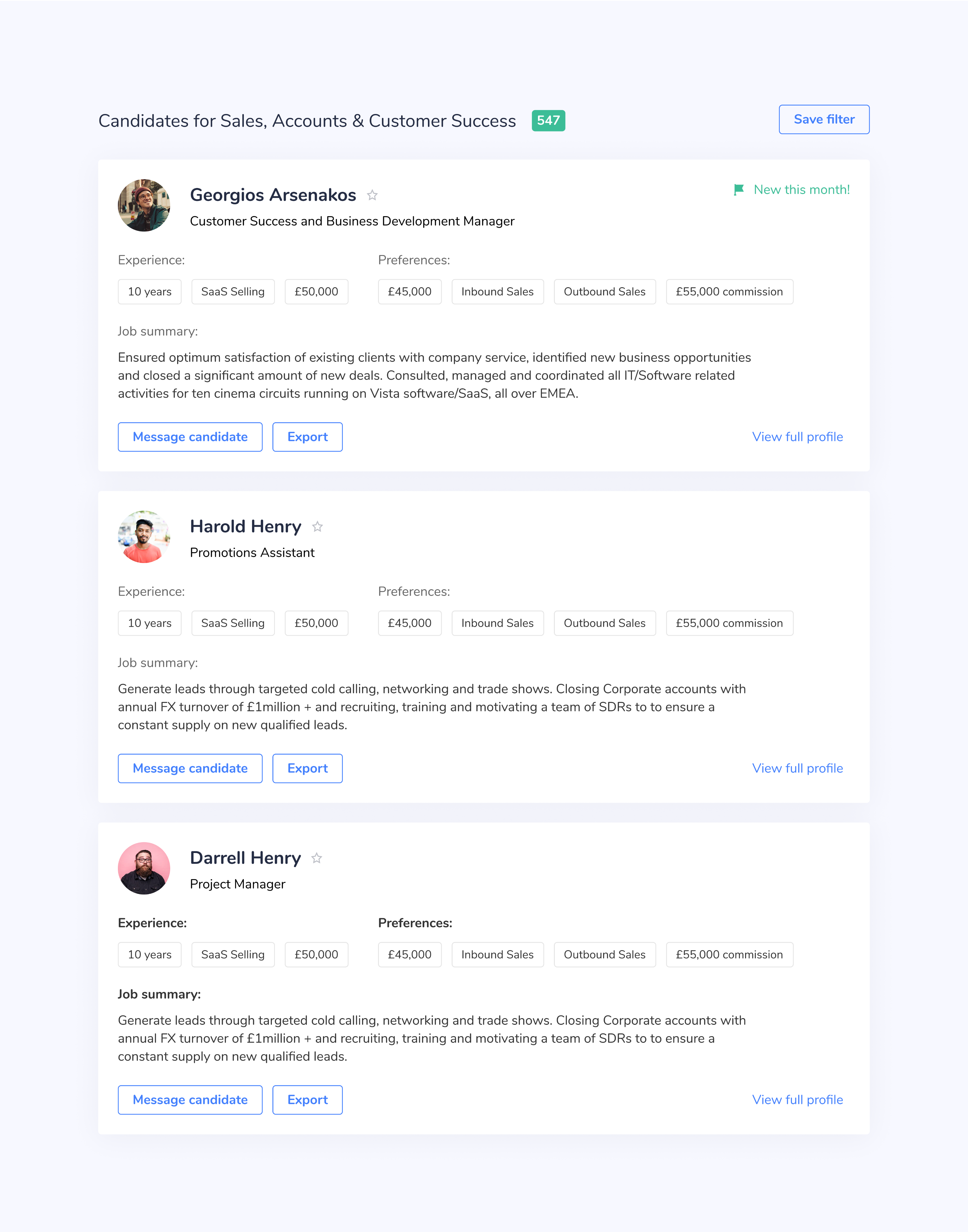 While a teammate led UX research, we frequently discussed findings together. Our users were primarily recruiters and specialists, mostly based in the UK and working in IT startups. That gave us a clear target for design decisions and persona creation.