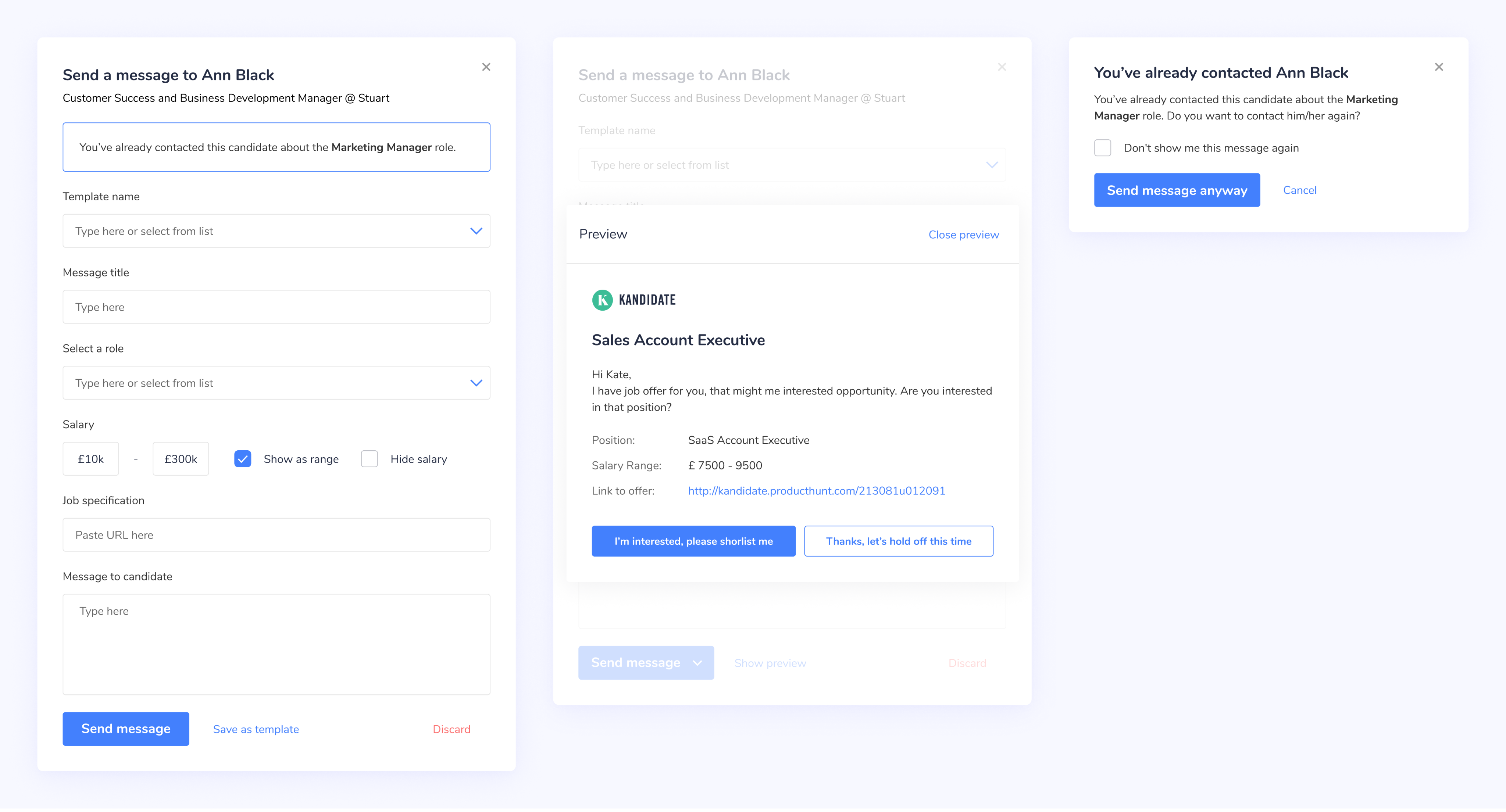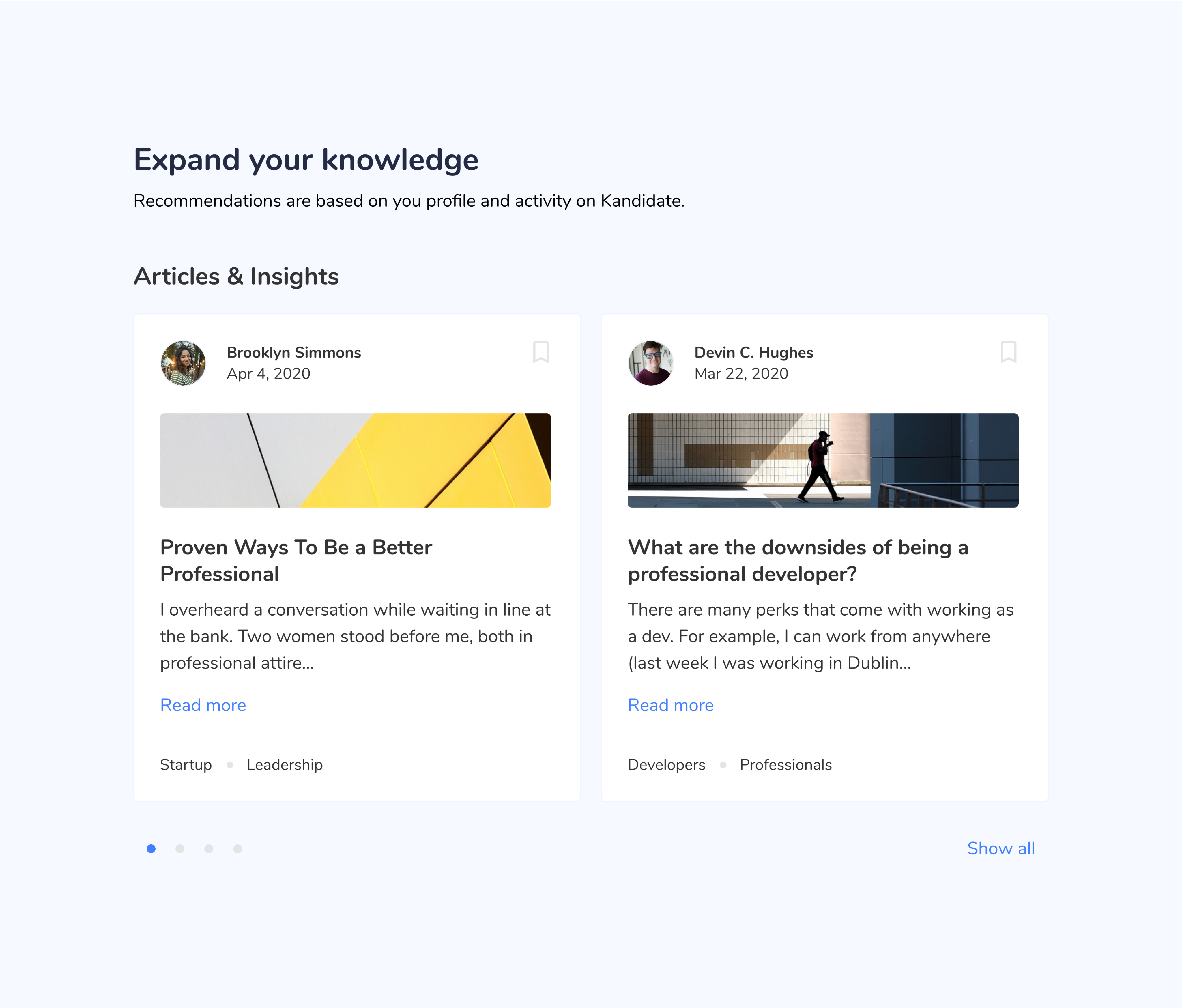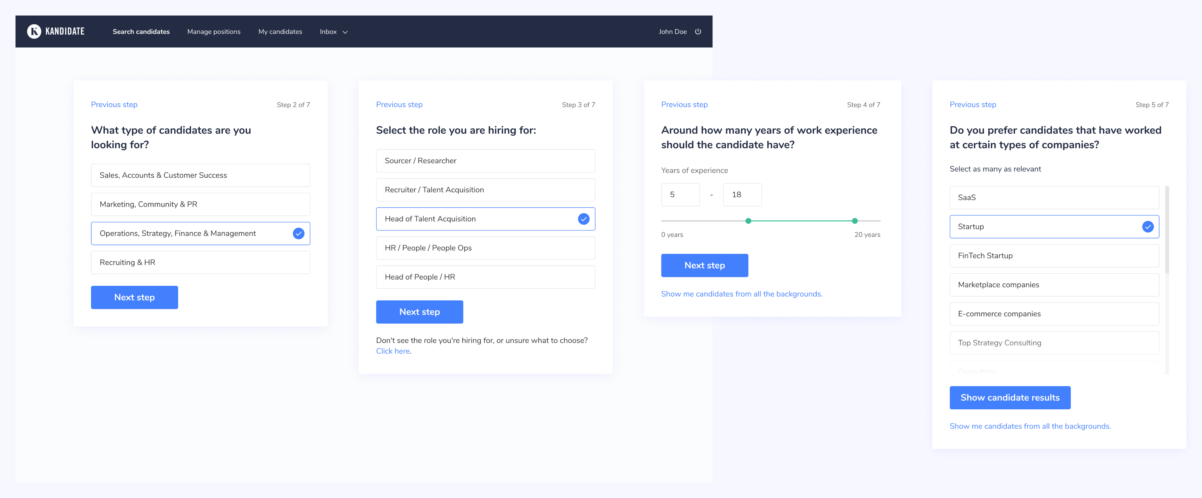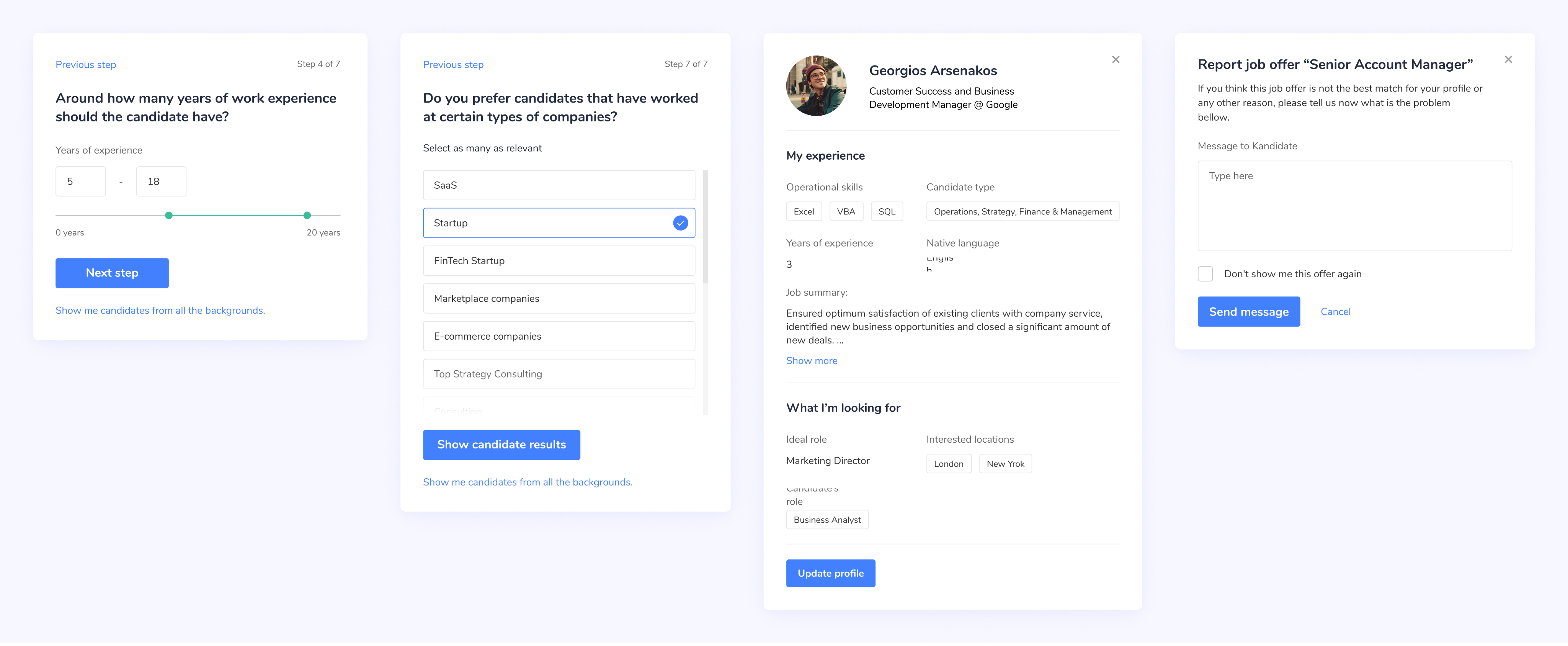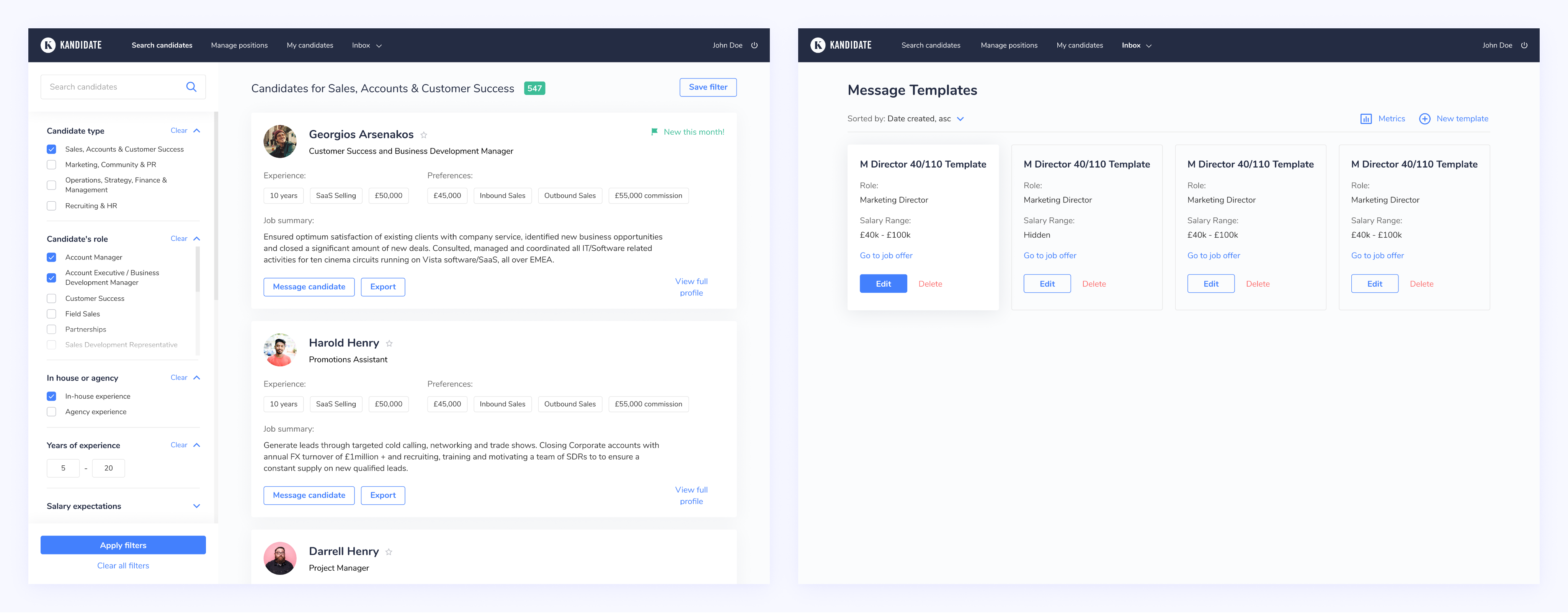 During my 9 months as a Product Designer at Kandidate, I had the chance to revisit and refine various ideas. Some light-touch, like landing pages to attract new users, and others that required deeper cognitive planning. No matter the scope, the results were always met with positive feedback or thoughtful input from the team.