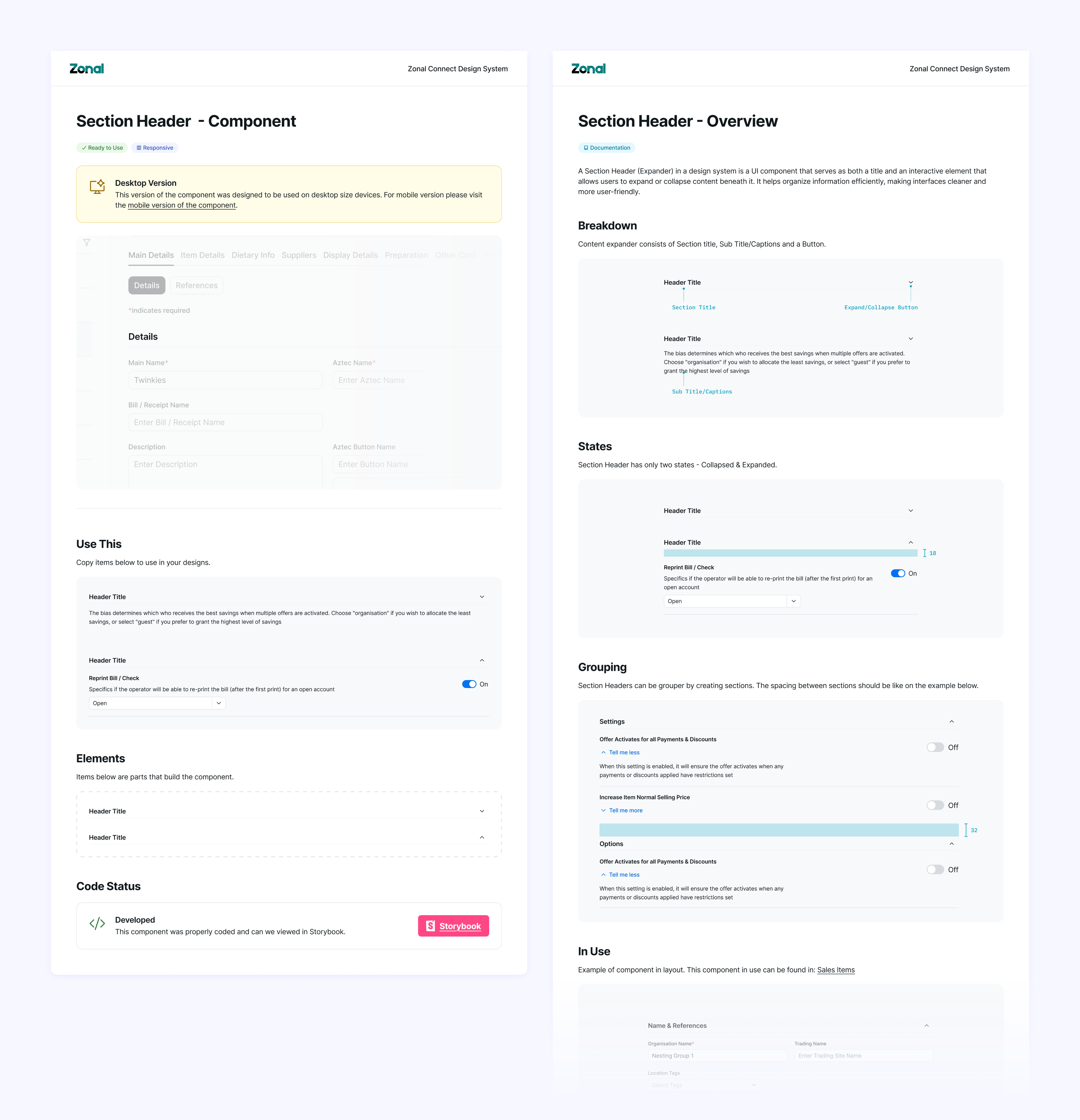 To strengthen identity and usability, we introduced custom iconography and branding assets tailored to each Zonal product. This helped distinguish offerings while reinforcing visual hierarchy across modules. Our team also rebuilt the component documentation from the ground up, making it clearer and more actionable for both designers and developers - especially those working with highly specific use cases or nested data structures.